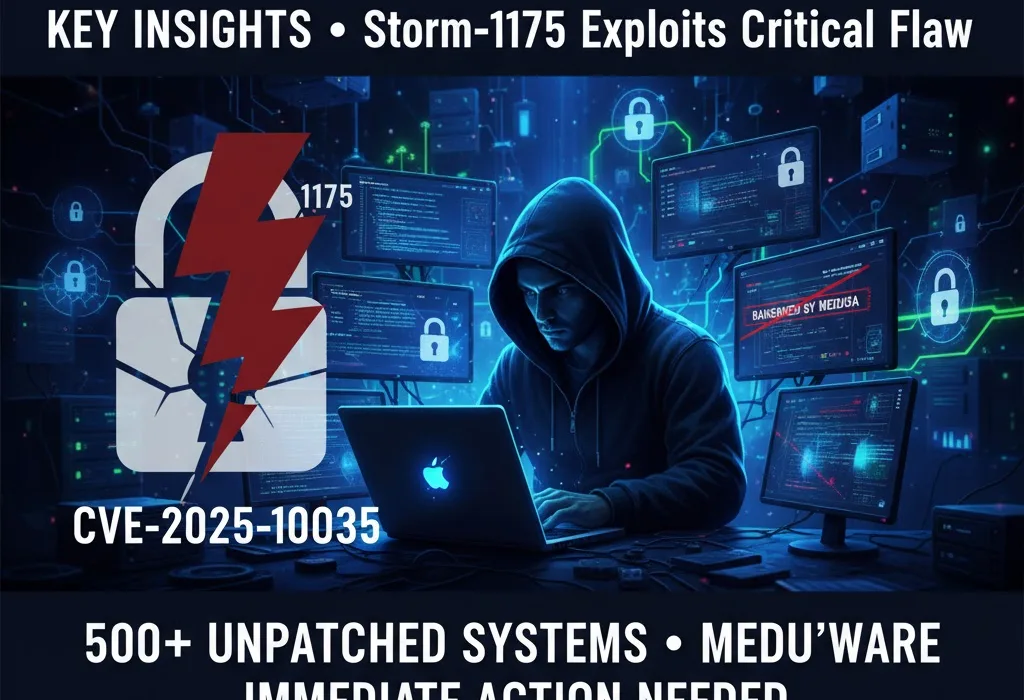 - Storm-1175 is actively exploiting the critical CVE-2025-10035 GoAnywhere MFT vulnerability to deploy Medusa ransomware.