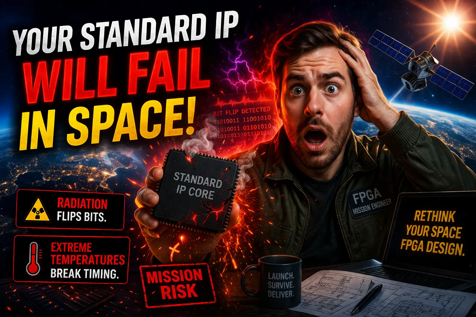 My short answer will be: No. Down here on Earth, we are spoiled. We use familiar Intellectual Property (IP) cores—DDR controllers, high-speed interfaces, processors, and communication blocks—and they work beautifully. But when you launch that FPGA into orbit, the environment drastically changes. There is nothing normal to be so sure about and suddenly your trusted IP becomes your biggest liability.